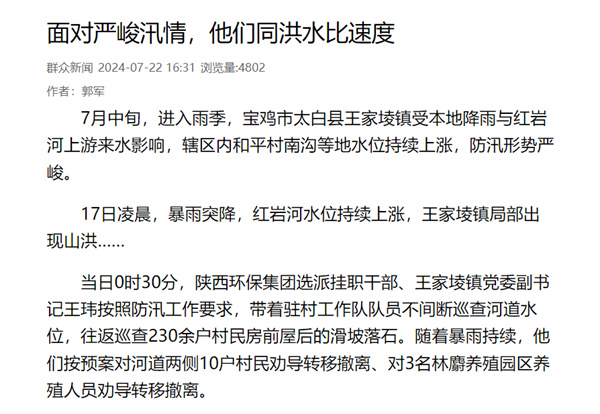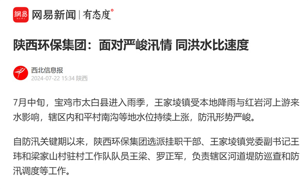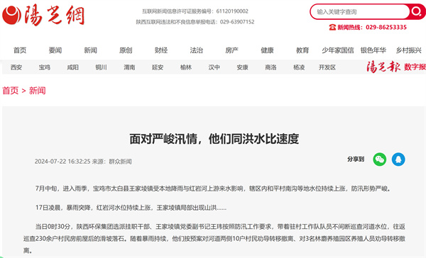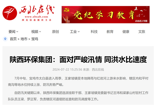 近日,學習強國、陜西日報-群眾新聞網、陽光網、華商二三里等主流媒體對“七下八上”防汛關鍵期以來,陜西環保集團選派掛職干部、駐村工作隊隊員積極服務轄區防汛抗洪等工作情況進行了報道,有力展示了集團職工聞令而動、挺身而出,勇挑重擔、沖鋒在前的良好風貌。現集中刊載如下,以饗讀者。